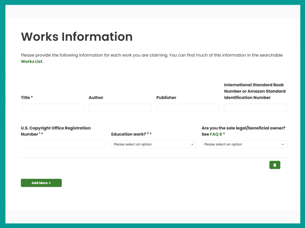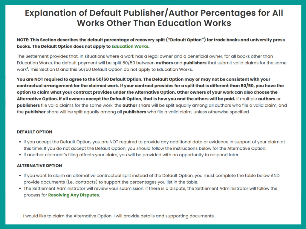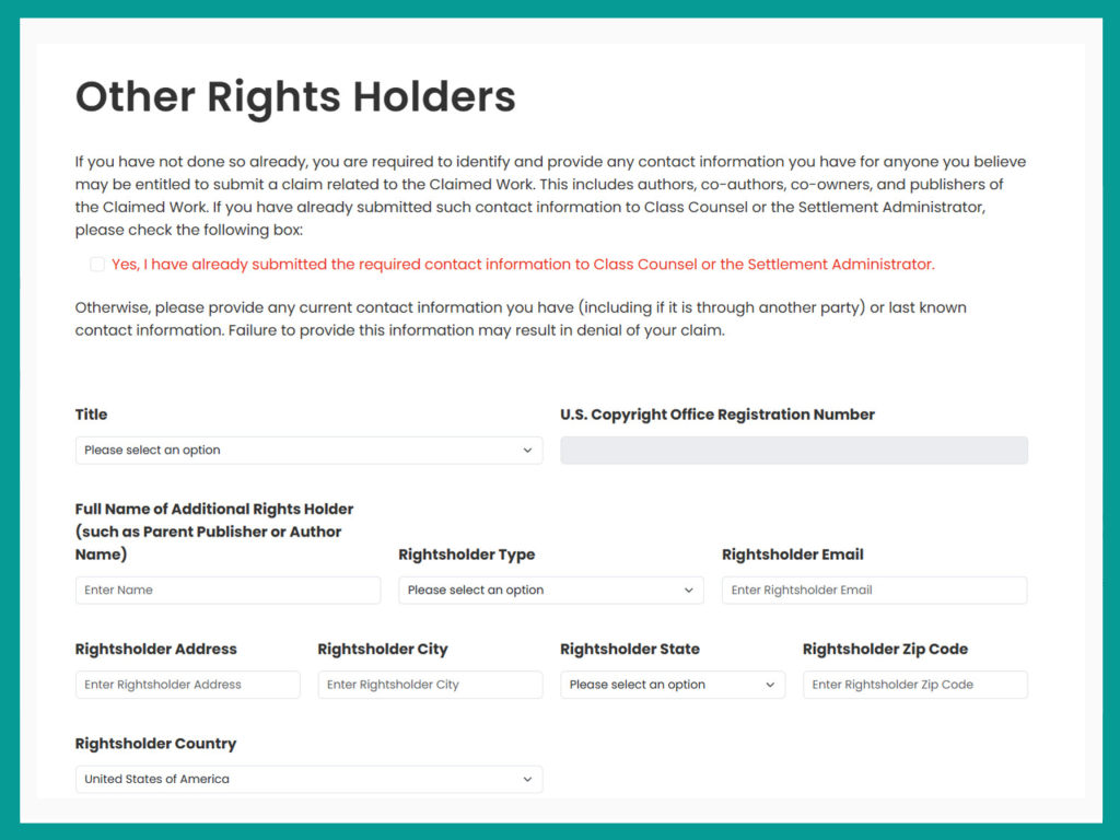 How to File a Claim in the Anthropic Settlement: Step-by-Step Guide Share on Twitter (opens in a new tab) on Facebook (opens in a new tab) on Linkedin (opens in a new tab) via email What You’ll Need: U.S. Copyright Office Registration Number for each work (can be found in the Works List Lookup) ISBN or ASIN for each work (can be found in the Works List Lookup) Publisher contact information (if applicable) Your publishing contract (if claiming a split other than 50/50) Payment details (bank account info for ACH/Zelle, or mailing address for check) Important Deadline: All claims must be submitted by March 30, 2026. Step 1: Check Eligibility. Start at the main settlement website. Before filing a claim, you must confirm your book is included by clicking the “Works List Lookup” link. Step 2: Search for Your Work. Use the available search options (Author, ISBN/ASIN, Title, etc.) to find your book(s). Step 3: Confirm Matches. If your works are eligible, they will appear in this table. Gather the exact details (Title, Author, Registration Number) for the next step, which will require you to enter ISBN, Registration Number and other details. Step 4: Start the Claim. Start the claim by clicking “File a Claim” on the main page, which will take you to this page. If you are filing before receiving notice, you will not have a Unique ID (Unique IDs will be sent by the Settlement Administrator along with the notice starting late November). You don’t have to wait for the notice and Unique ID To file the claim. Your claim will still be received and processed. Click “I don’t have a Unique ID.” (Or if you have received a Settlement Notice, enter your unique ID here.) Step 5: Enter Your Details. Fill in all required contact information. Authors based outside of the U.S. are eligible for payment, and the form will change accordingly if you select a country other than the United States. Step 6: Select Claimant Type. Identify your role in owning the copyright. Options include Author, Publisher, Loan Out Company (LLC), Literary Trust, Literary Estate, and Other. You must be a legal, beneficial, or sole owner of the reproduction right to be eligible. If your copyrights are owned by an LLC then you will select Author Loan-Out Company. Step 7: Enter Work Details. For each eligible book, fill in the Title, Author, Publisher, U.S. Copyright Office Registration Number, and any identification numbers (ISBN/ASIN). Answer if the work is an Education Work. Note on Education Works: Education Works are works published by education publishers. Education publishers specialize in creating and publishing works, including but not limited to textbooks, for the instruction of students and professionals, which are distributed for and through educational and professional markets. The Anthropic Works List Lookup identifies which works are Education Works. The default 50/50 Split does not apply to these works; your recovery split will be determined by your contract (See Step 9 for details). Select whether you are the sole legal/beneficial owner. Under copyright law, when the author grants the publisher an exclusive license to publish the book in exchange for percentage royalties, the publisher is deemed the legal owner of the publication rights granted to it, and the author is deemed the “beneficial” owner of that right. This is also true if the author assigns the entire copyright to the publisher such that the publisher is the full copyright owner, but the author is still entitled to royalties, license fees and other benefits from exploitation of the work. However, if the book has gone out of print and the rights have reverted to the author or the license terminates, the author becomes the legal owner again. Select “Yes” if you are a self-published author, or have rights reverted to you. Select “No” if you have a publisher and/or co-author. Step 8: Identify Other Rightsholders. For any work that is not solely owned by you, use the provided fields to list the full name, rightsholder type, and contact information (if known) for the publisher, co-author, or other co-owner. Failure to provide this information may result in your claim being denied. Step 9: Accept Default Split or Choose Alternative Option. The claim has a built in default split, which splits the settlement award 50-50. This option is NOT available to educational works and textbooks. These defaults are based on typical publishing arrangements and are used to simplify the claims process. If you are a non-education work author, you can choose the default by clicking Next or you can select Alternative Option, if you believe you are entitled to a split other than 50-50. If you are an author of an education work you must select the Alternative Option. If choosing the Alternative Option, you must complete the table to specify your recovery percentage. You must provide contracts or documentation to support any percentage other than the default. If you do not provide the contract, the Default Option will be applied to your claim. Step 10: Select Payment Method. Choose your preferred method to receive the settlement payment: ACH, Zelle, or Check. Step 11: Review and Submit. Review the final summary of all entered information, provide your required signature, and click Submit. The deadline to submit a claim is March 30, 2026.