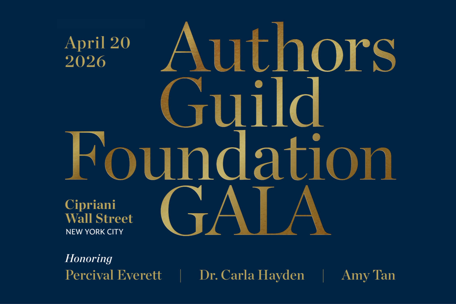 2026 Authors Guild Foundation Gala Share on Twitter (opens in a new tab) on Facebook (opens in a new tab) on Linkedin (opens in a new tab) via email Cipriani Wall Street55 Wall Street, NYC 6 P.M. VIP Reception · 6:30 P.M. General Reception7:30 P.M. Dinner & Program · 9:30 P.M. After PartyBlack Tie Optional Celebrate with us on Monday, April 20, 2026, at Cipriani Wall Street as we honor Percival Everett, Dr. Carla Hayden, and Amy Tan at the Authors Guild Foundation Gala. This unforgettable evening raises vital funds for the Foundation’s programs and advocacy, protecting writers’ rights, combating censorship, and fostering a vibrant landscape for readers and writers alike. TICKETS AFTER PARTY TICKETS SPONSOR JOURNAL ADS SUPPORT Honoring Percival Everett Baldacci Award for Literary Activism Dr. Carla Hayden Champion of Writers Award Amy Tan Preston Award for Distinguished Service to the Literary Community Special Guests Cord JeffersonAcademy Award-Winning Writer and Director Christian CooperEmmy Award-Winning Television Host and Bestselling Author Honorary Chair Dakota JohnsonActor and Producer 2026 Sponsors History Sponsors Suzanne Collins & Charles Pryor · Spotify for Authors Novel Sponsors Anonymous · Charleston Literary Festival · Hachette Book Group · HarperCollins Publishers · Penguin Random House · Douglas & Christine Preston Anthology Sponsors Audible · Books-A-Million · Lesher Family Foundation · Macmillan Publishers · Sourcebooks Biography Sponsors Marie Arana & Jonathan Yardley · Brisa & Mark Carleton · Patti Callahan Henry · Leon Levy Foundation · Libby, the library app · Susanna Porter & James Clark · RBmedia · Karyn Schoenbart, Duo Partners · Scholastic Inc. · Simon & Schuster · R.L. & Jane Stine · Writers House Click here to learn about sponsorship opportunities. 2026 Gala Committee Co-Chairs Marie Arana · Brisa Carleton · Patti Callahan Henry · Meredith LesherHonorary Co-Chair: Christina Baker Kline Lucy Ferriss · Amity Gaige · Steph Opitz · Vanessa LeFebvre · Susanna Porter · Jessica Shattuck · Joanna Stone · Randy Winston